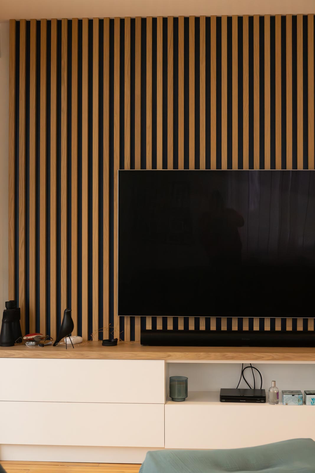 Bibliothèques et meubles intégrés sur-mesure, pour structurer une pièce sans l’alourdir. Niches, fermés/ouvert, passages de câbles : on pense à tout.