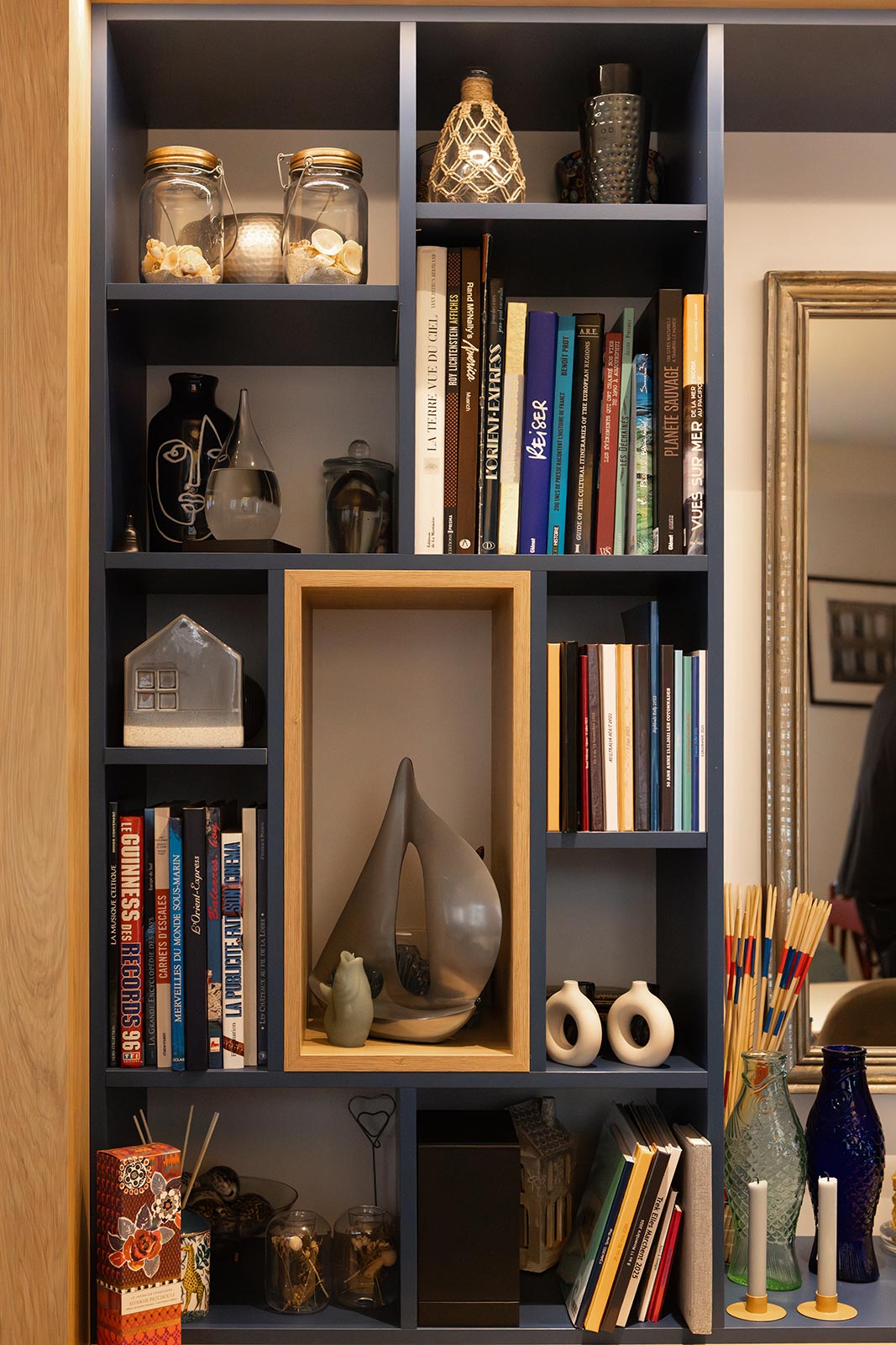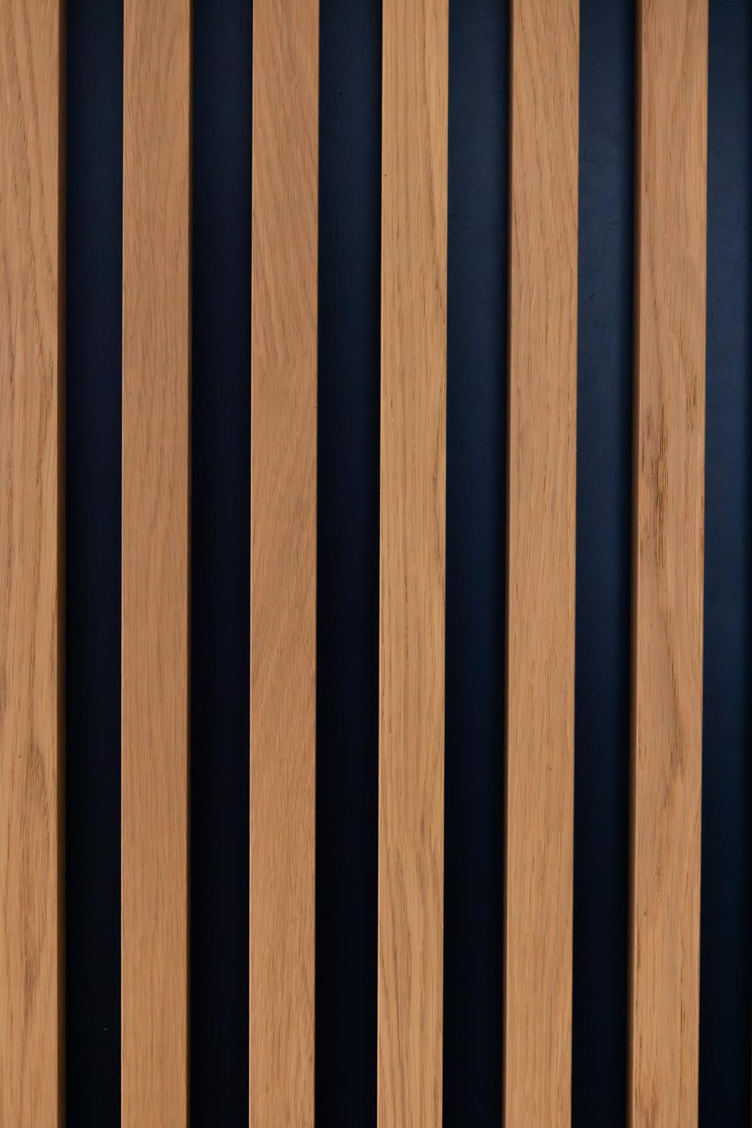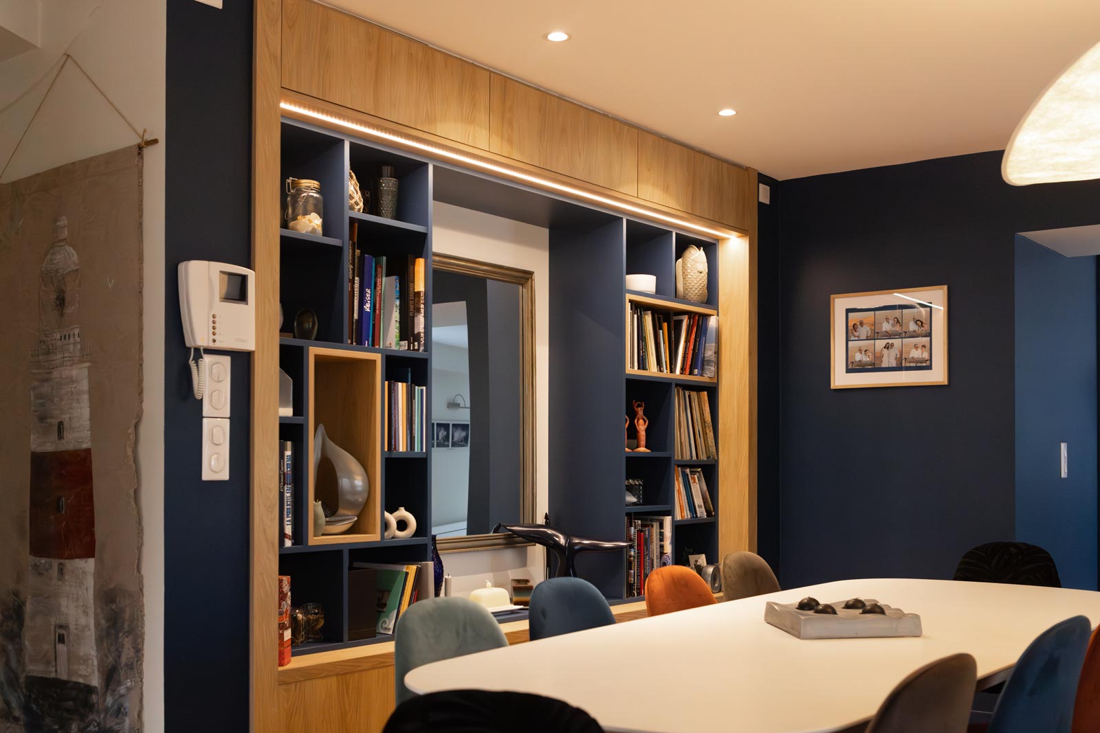 Une bibliothèque en panneau mélaminé Egger prolonge la composition. L’ensemble est unifié par un habillage mural en tasseaux de chêne naturel, fixés sur le mur avec un dos en feutre pour l’isolation phonique. Le résultat : un mur qui raconte quelque chose, au lieu de simplement exister.