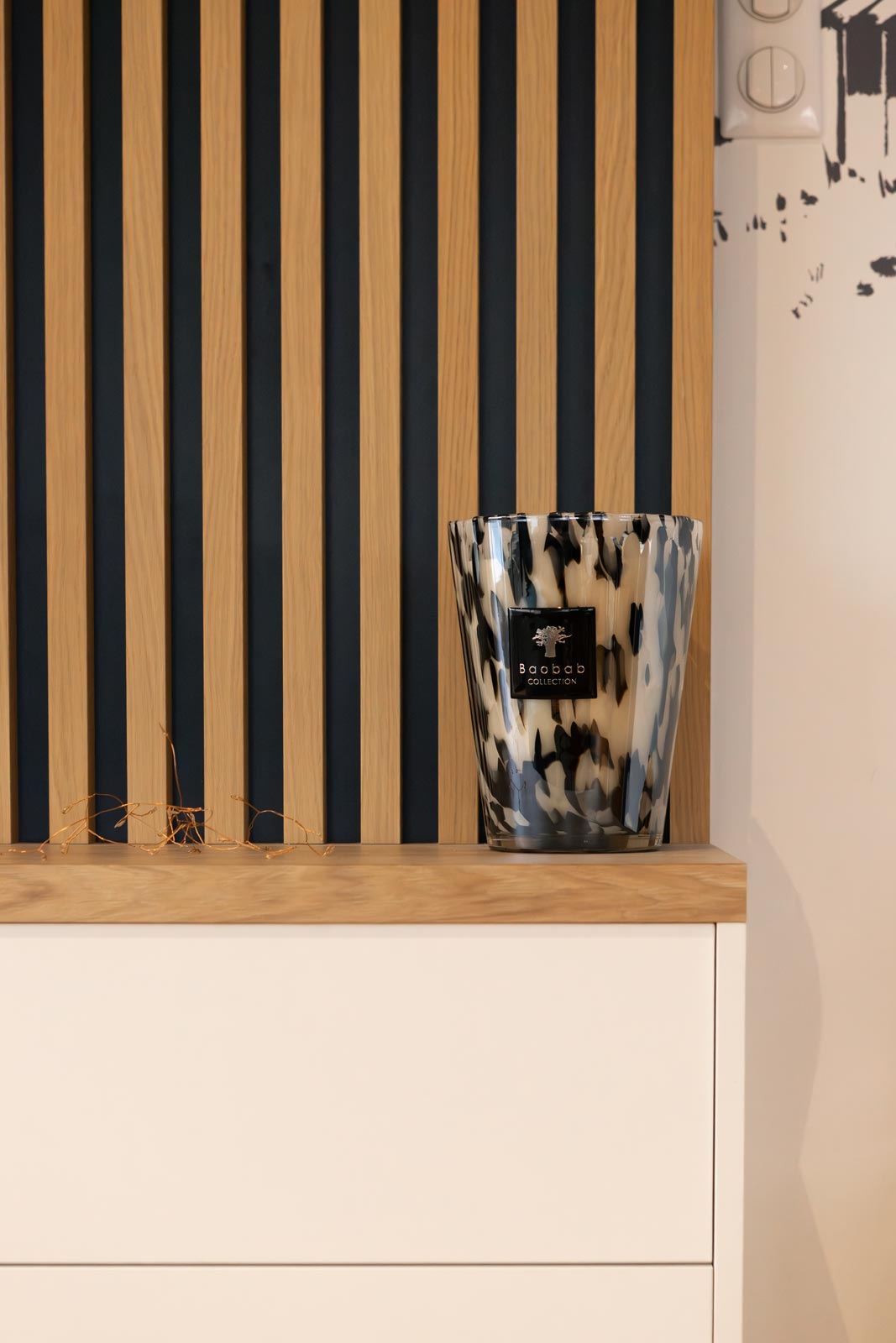 Le meuble TV a été conçu pour accueillir tous les branchements et masquer le désordre des câbles. À droite, une bibliothèque en panneau mélaminé Egger prolonge la composition. L’ensemble est unifié par un habillage mural en tasseaux de chêne naturel, fixés sur le mur avec un dos en feutre pour l’isolation phonique. Le résultat : un mur qui raconte quelque chose, au lieu de simplement exister.