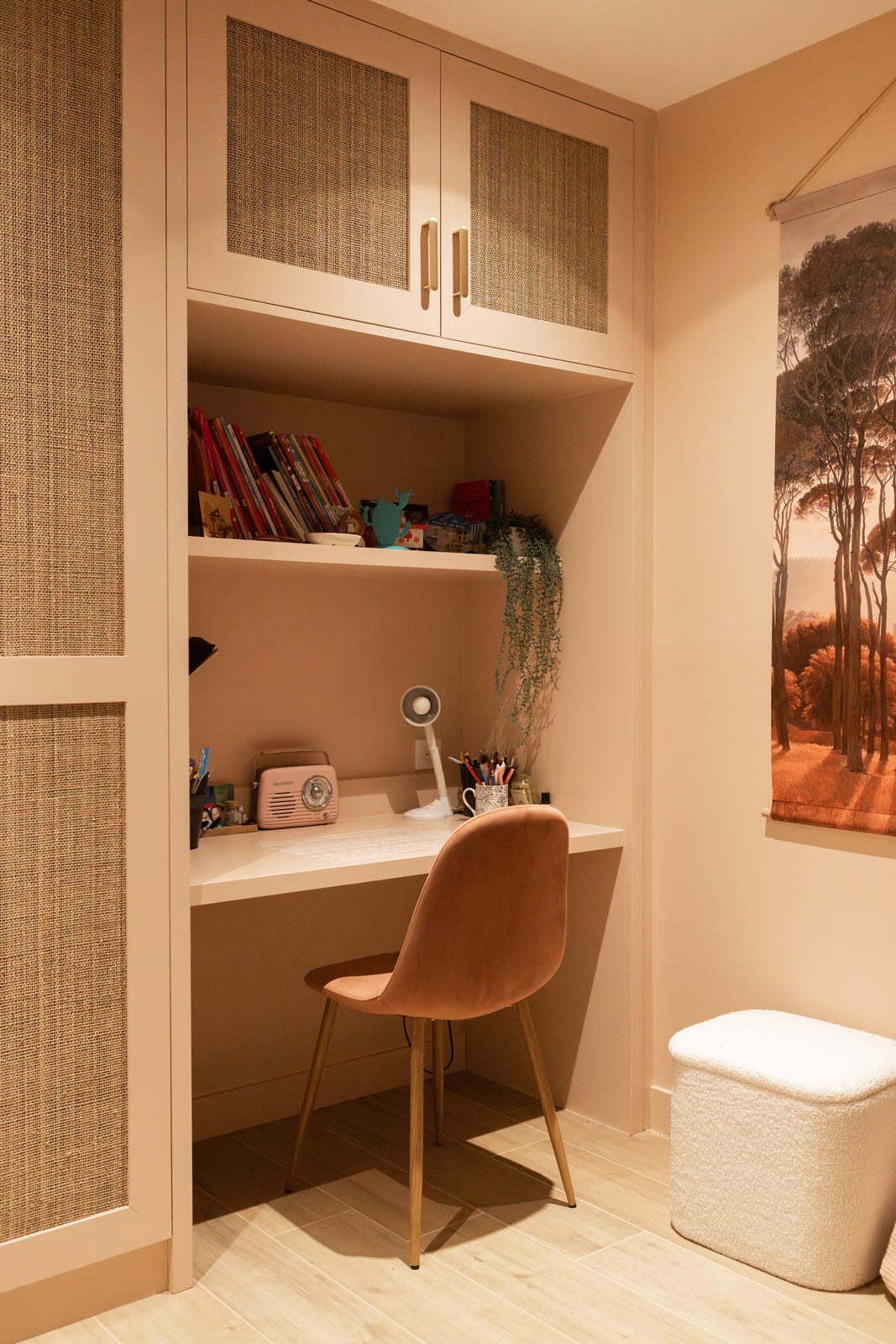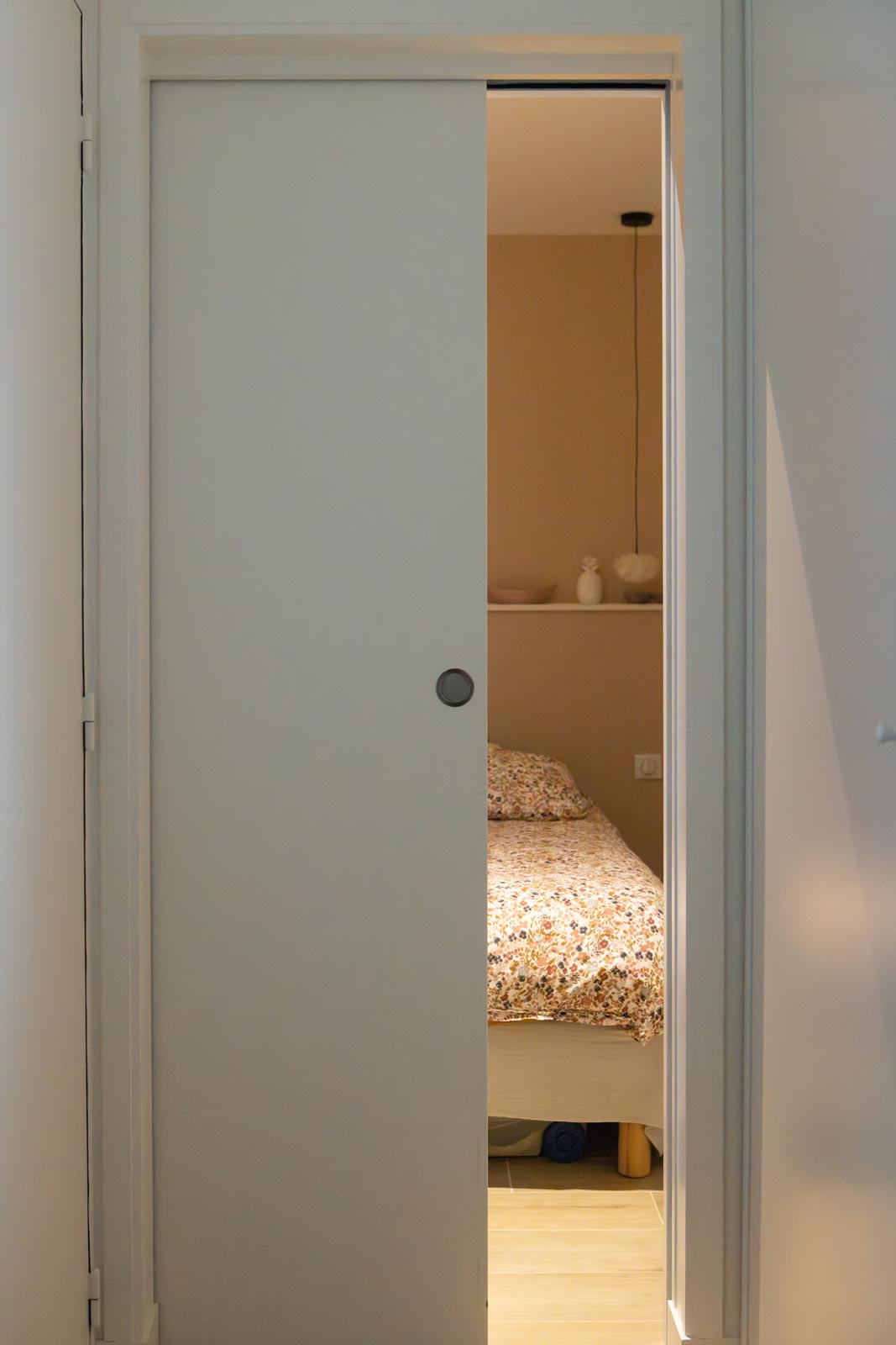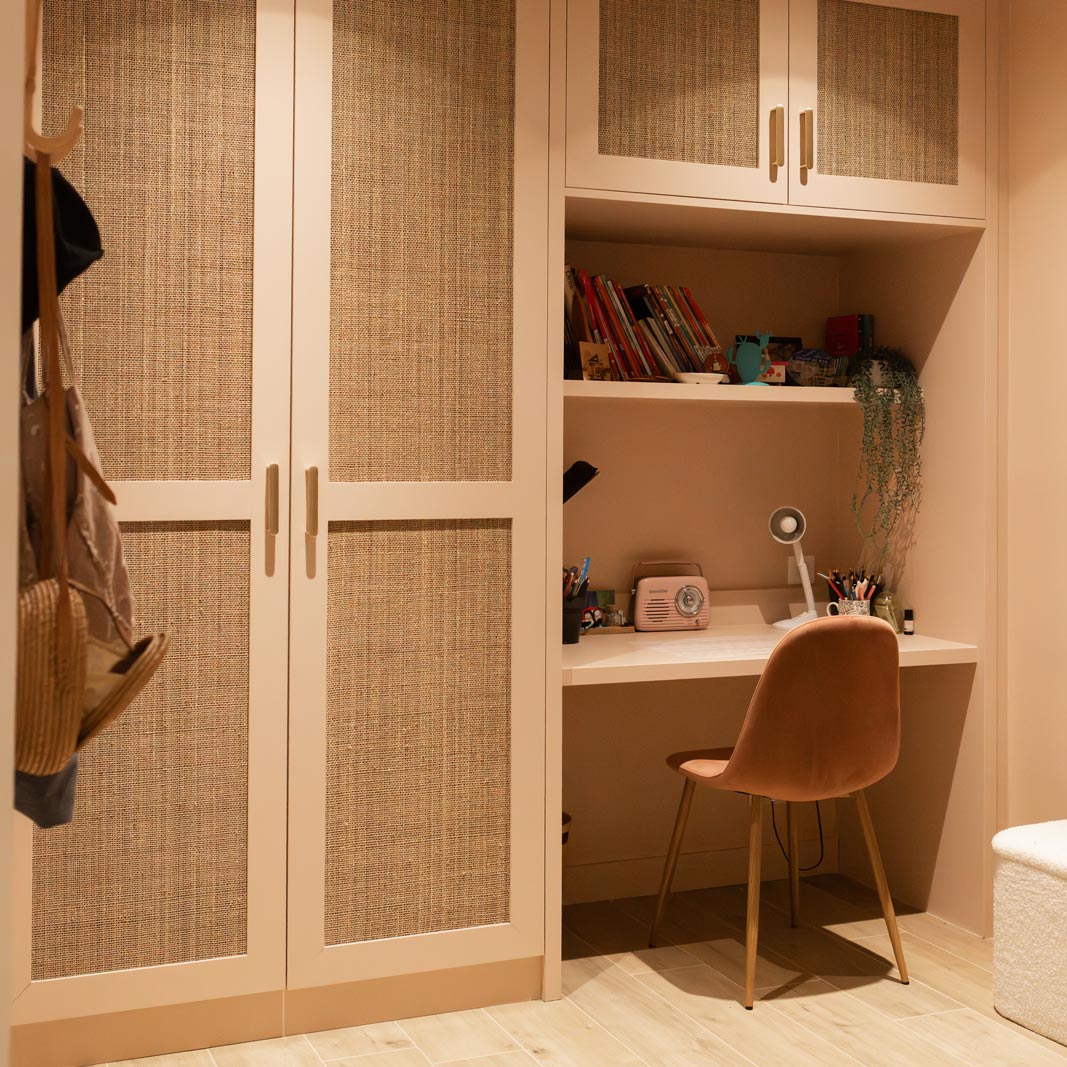 Le placard de la chambre du bas intègre un dressing en moucharabieh et un espace bureau, le tout en médium à peindre. Les portes filtrées laissent respirer le contenu, le bureau se glisse dans la continuité du meuble. La pièce gagne en rangement sans perdre un centimètre de légèreté.