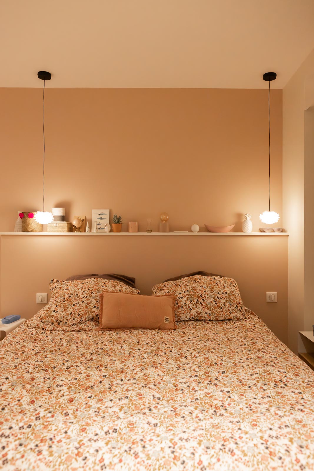 La tête de lit en médium à peindre intègre les interrupteurs directement dans le panneau. Pas de boîtiers visibles, pas de fils à chercher – tout est à portée, tout est propre. Le panneau apporte une présence au mur sans l’alourdir.
